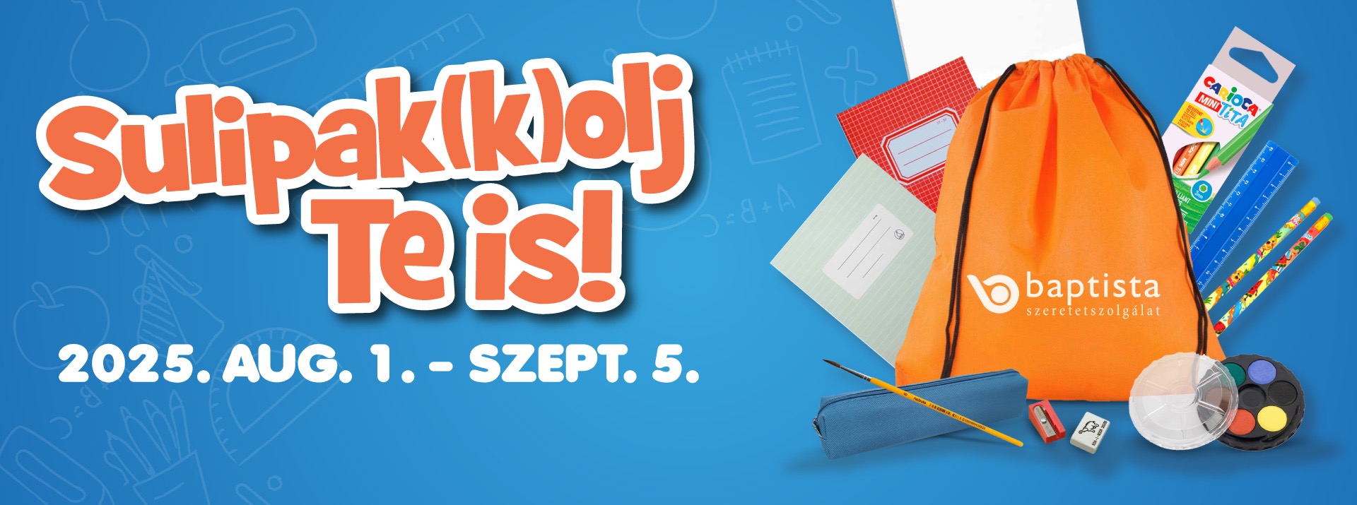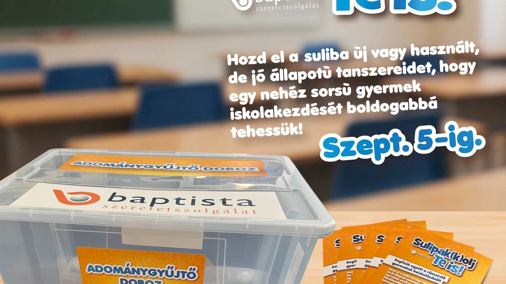 Augusztus 1-től szeptember 5-ig munkaidőben a Baptista Szeretetszolgálat fővárosi központjában, a Hungária körút 69-es szám alatt, a segélyszervezet pákozdi logisztikai központjában várjuk az iskolakezdést segítő adományokat.